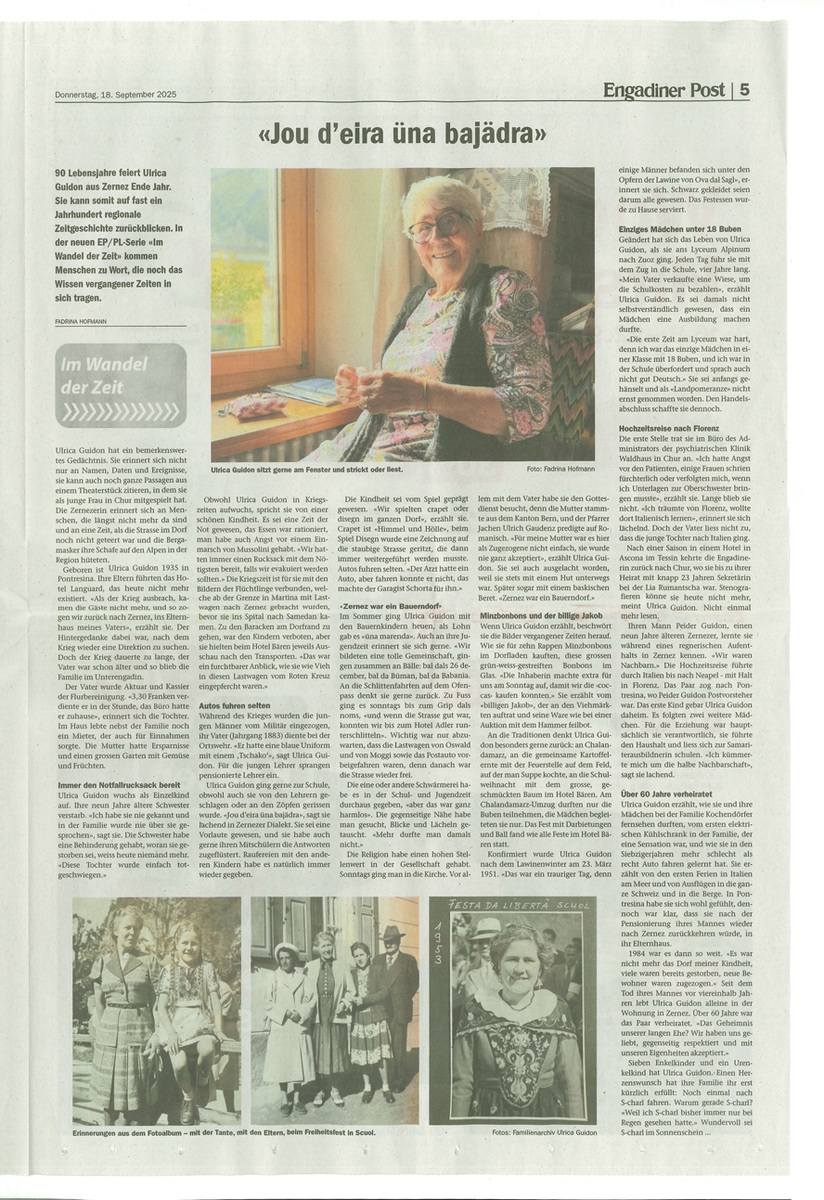 90 Lebensjahre feiert Ulrica Guidon aus Zernez Ende Jahr. Sie kann somit auf fast ein Jahrhundert regionale Zeitgeschichte zurückblicken. In der neuen EP/PL-Serie «Im Wandel der Zeit» kommen Menschen zu Wort, die noch das Wissen vergangener Zeiten in sich tragen.