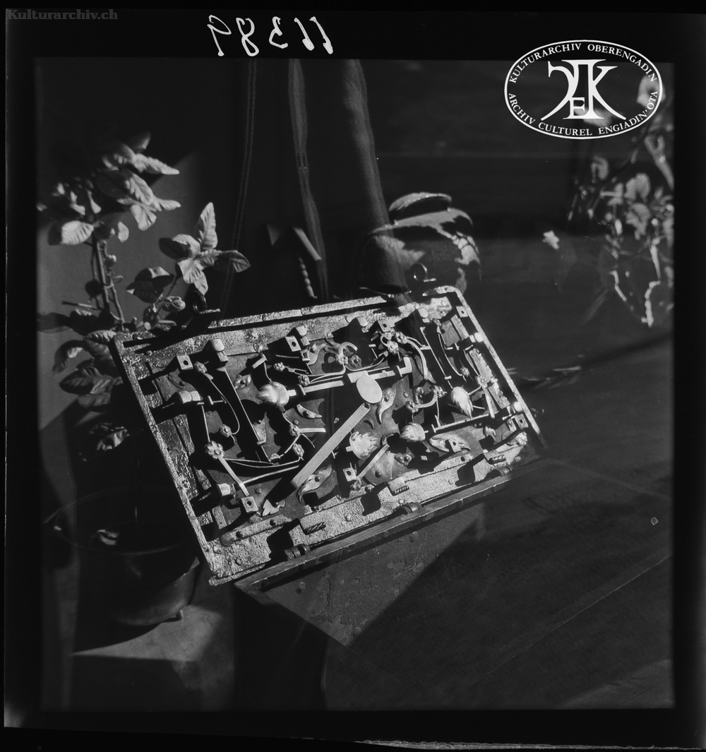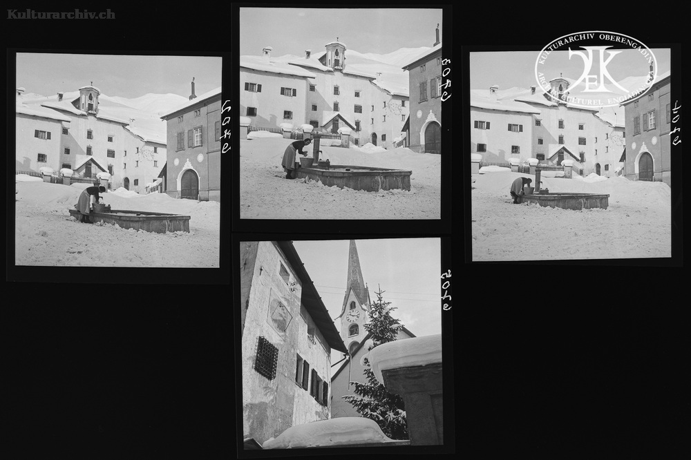 Diverse schwarz-weiss Negativ Fotografien auf Glas und Zelluloid zu Chalandamarz Samedan 1941, Charreda Samedan, Giuventüna Abendball im Hirschen 1937. Katholische Kirche, Kirche San Peter und Reformierte Kirche in Samedan. Schmiede- und Schreinerkunst. Blumenstudie. Musiker mit Handorgel. St. Moritz Kurhaus. St. Moritz Schiefer Turm. Postauto am Malojapass. Sils Baseglia. Zuoz Aguêl, Zuoz Plagnoula 175 und Zuoz Haus Poult.