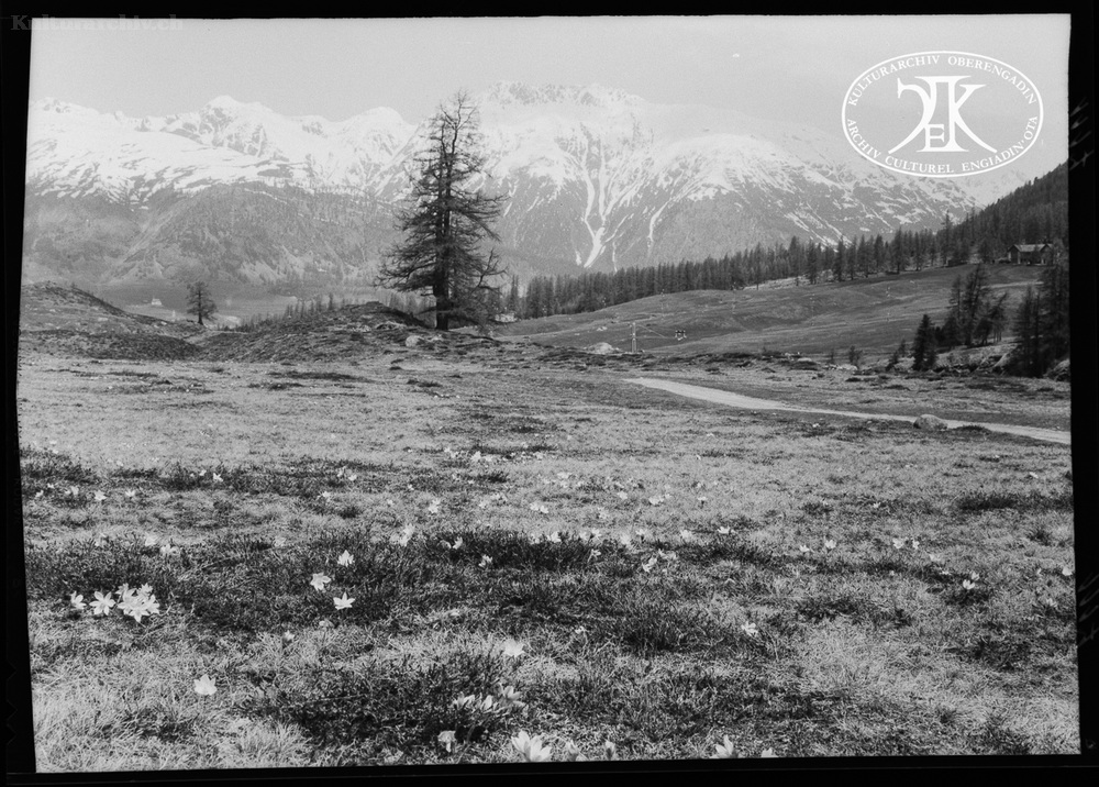 Bauer am Rechen mit Pferde bei Bever. Krokus Pfad in Samedan. Stimmungen Krokus Wiese. Krokus Wiese bei Samedan. Blumenwiese bei Pontresina. Frühlingsblumen. Stimmungen bei Samedan Aue. Stimmungen bei Samedan Gravatscha.