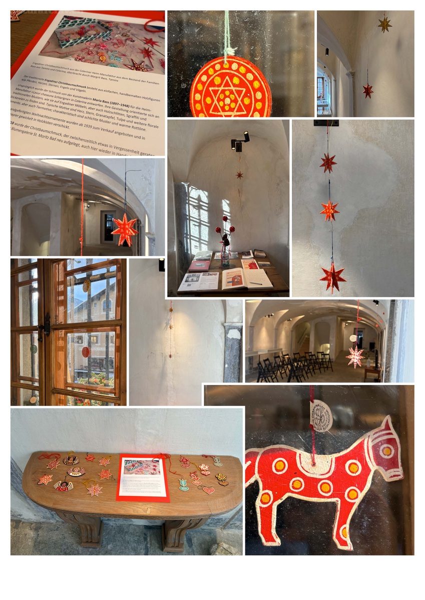 11 Blumen, 3 Herzen, 9 Sterne, 14 Sterne 3-D, 7 Kreise mit Hexagramm; 1 Ring, 1 Glocke, 1 Dame in Engadinertracht, 5 Pferde, 1 Fisch.
