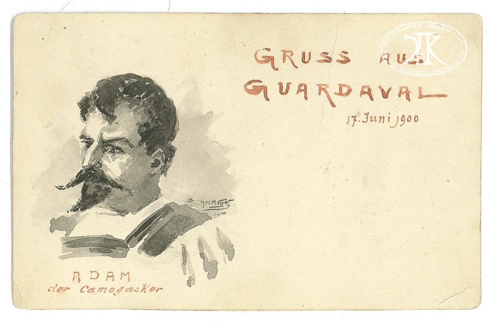 2 leere Postkarten. Abbildungen: Gruss aus Guardaval 17. Juni 1900, Adam der Camogasker; S-chanf.