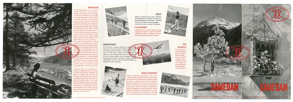 Vorderseite: Samedan, Bergsport, Golf, Flugsport, Wintersport, Skischule.